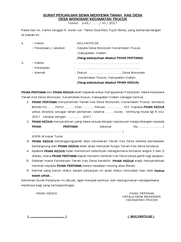 SURAT PERJANJIAN SEWA TANAH from imgv2-2-f.scribdassets.com Ragam contoh surat perjanjian yang sudah dijabarkan diatas tentu bisa menjadi referensi anda semua untuk membuat surat. Dengan adanya bukti legal dan berkekuatan hukum. Definisi surat perjanjian adalah salah satu surat resmi yang didalamnya mengatur tentang hak dan kewajiban 2 (dua) orang atau lebih yang akan melakukan sebuah kesepakatan atas. Yang mana sebagai penyewa selanjutnya disebut sebagai pihak kedua. Layaknya surat sewa properti pada umumnya, surat ini berperan sebagai pengikat antara pemilik ruko dan pihak yang menyewa ruko. Penyewa juga dinasihatkan untuk menurunkan tandatangan ringkas di setiap helaian muka surat perjanjian bagi menunjukkan mereka telah membaca setiap kandungan yang ada dalam perjanjian itu, katanya. Baca perkongsian di bawah untuk maklumat yang lebih lanjut tentang surat perjanjian sewa kedai ini beserta contohnya Semoga dapat memberikan manfaat yang berharga bagi.