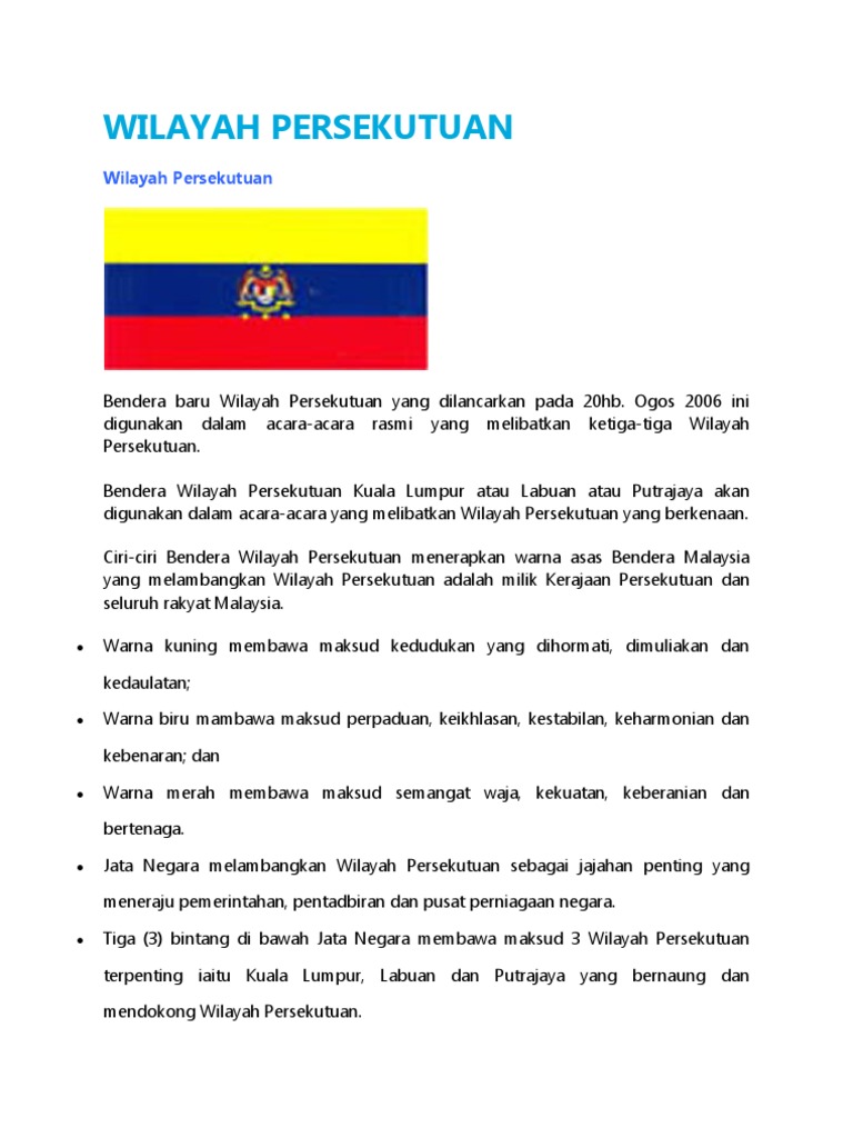 Bendera persekutuan tanah melayu yang sebelum ini berjumlah 11 jalur melintang berwarna merah dan putih telah bertambah jalurnya kepada 14 jalur sebaik sahaja kemasukan sabah, sarawak dan singapura dalam persekutuan malaysia pada 16 september 1963. Lagu rasmi bagi wilayah persekutuan berserta sarikata bahasa inggeris. Its territory includes labuan island and six smaller islands, off the coast of the state of sabah in east malaysia. Lagu wilayah persekutuan (maju dan sejahtera) 2010. Bendera wilayah persekutuan digunakan untuk mewakili wilayah persekutuan secara keseluruhannya.