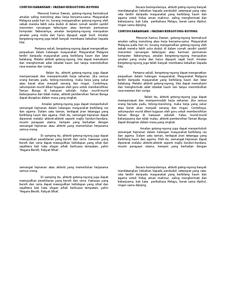 Gotong royong di sekolah wajib dilakukan agar pekerjaan dapat selesai dengan cepat dan bisa dinikmati oleh semua warga sekolah. Contoh karangan tentang gotong royong adalah. Cerita inspiratif dari warga indonesia yang memilih membantu satu sama lain saat menghadapi pandemi virus corona. Oleh itu, kegiatan ini perlu disemarakkan kembali kerana banyak manfaatnya kepada masyarakat. Contoh karangan ramalan / fokus spm.